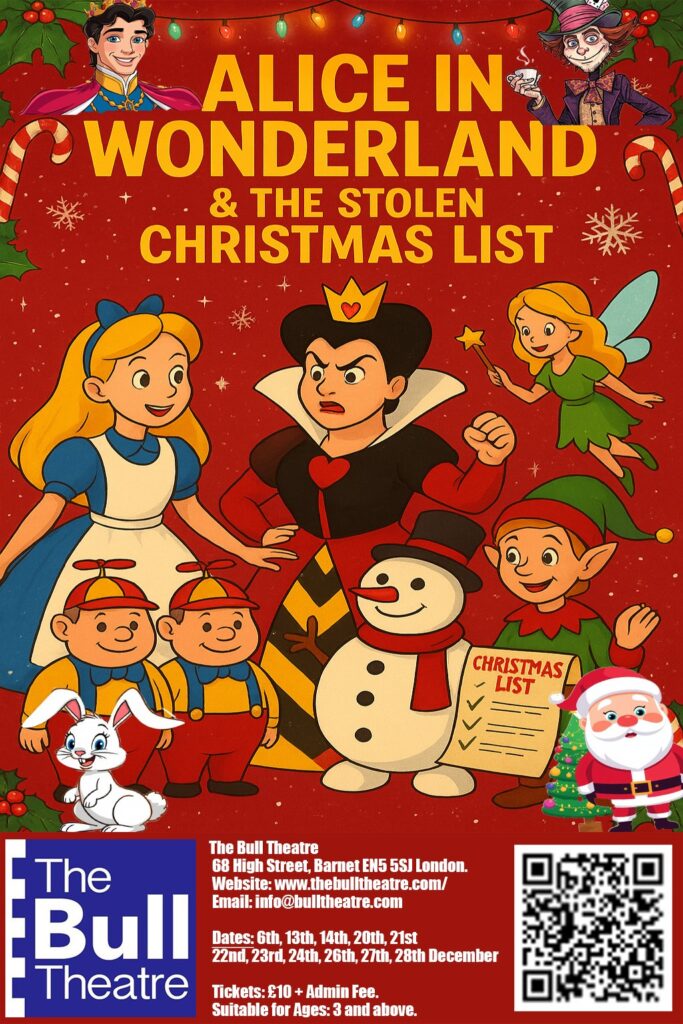 This festive season, we’re encouraging everyone to support our local community and enjoy a magical family performance right here in Barnet. The Bull Theatre presents Alice in Wonderland & The Stolen Christmas List. A fun-filled Christmas show that’s sure to delight audiences of all ages.
